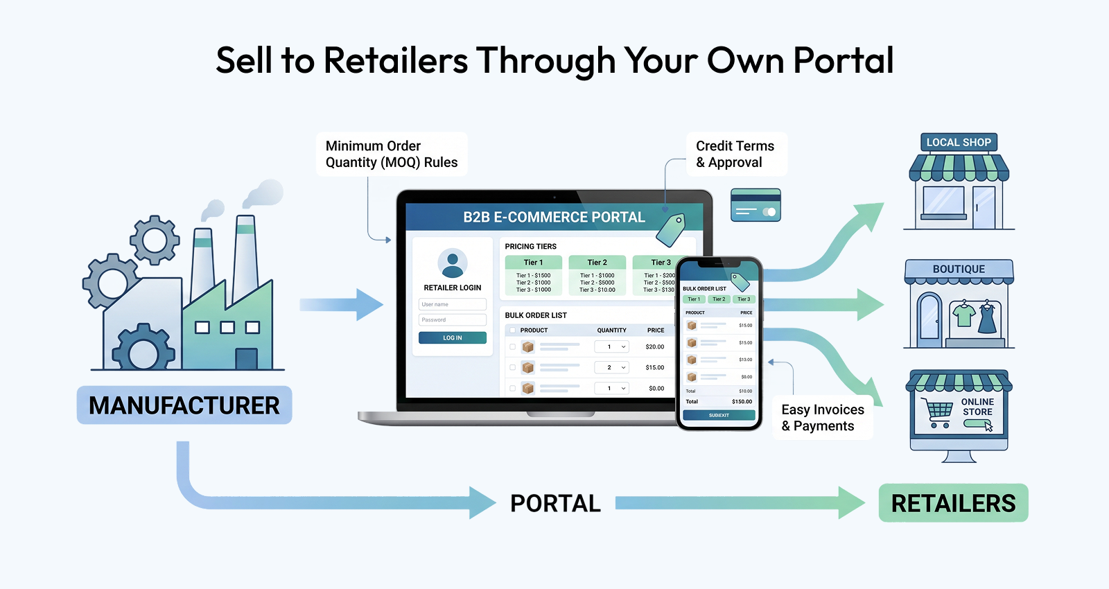 Quick Answer: B2B ecommerce for manufacturers means building a direct digital sales channel to retailers, wholesalers, and trade buyers — without relying on distributors as the intermediary. With the right platform, manufacturers can offer account-specific pricing, MOQs, trade credit terms, and a self-service ordering portal that lets retailers buy at any time without a sales call.