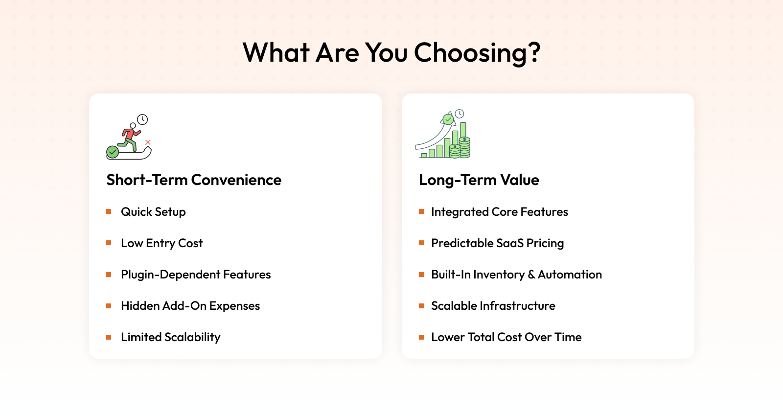 WooCommerce may appear cost-effective initially, but hosting, security, and developer maintenance create unpredictable expenses.