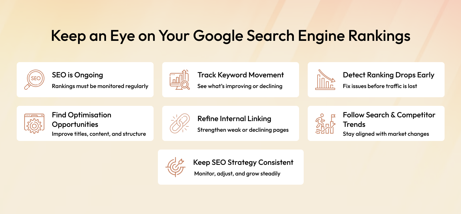 SEO is ongoing. After publishing content or launching new products, you must regularly monitor search rankings. This helps you understand which keywords are improving, which are declining, and where optimisation is needed. Ranking movement also reveals search trends and competitive changes.