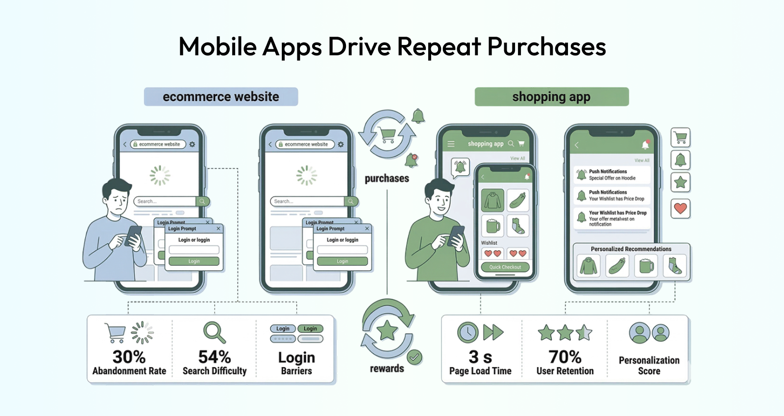 - Mobile apps help improve customer engagement and repeat purchases.