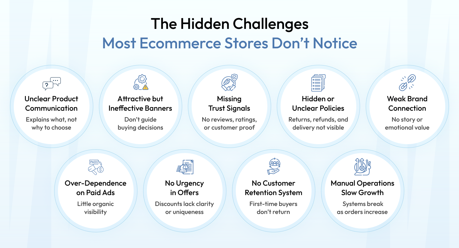 These challenges are often ignored because the store is still running. Orders come in. Ads generate clicks. But growth feels inconsistent and unpredictable. Some of the most common hidden challenges include:
