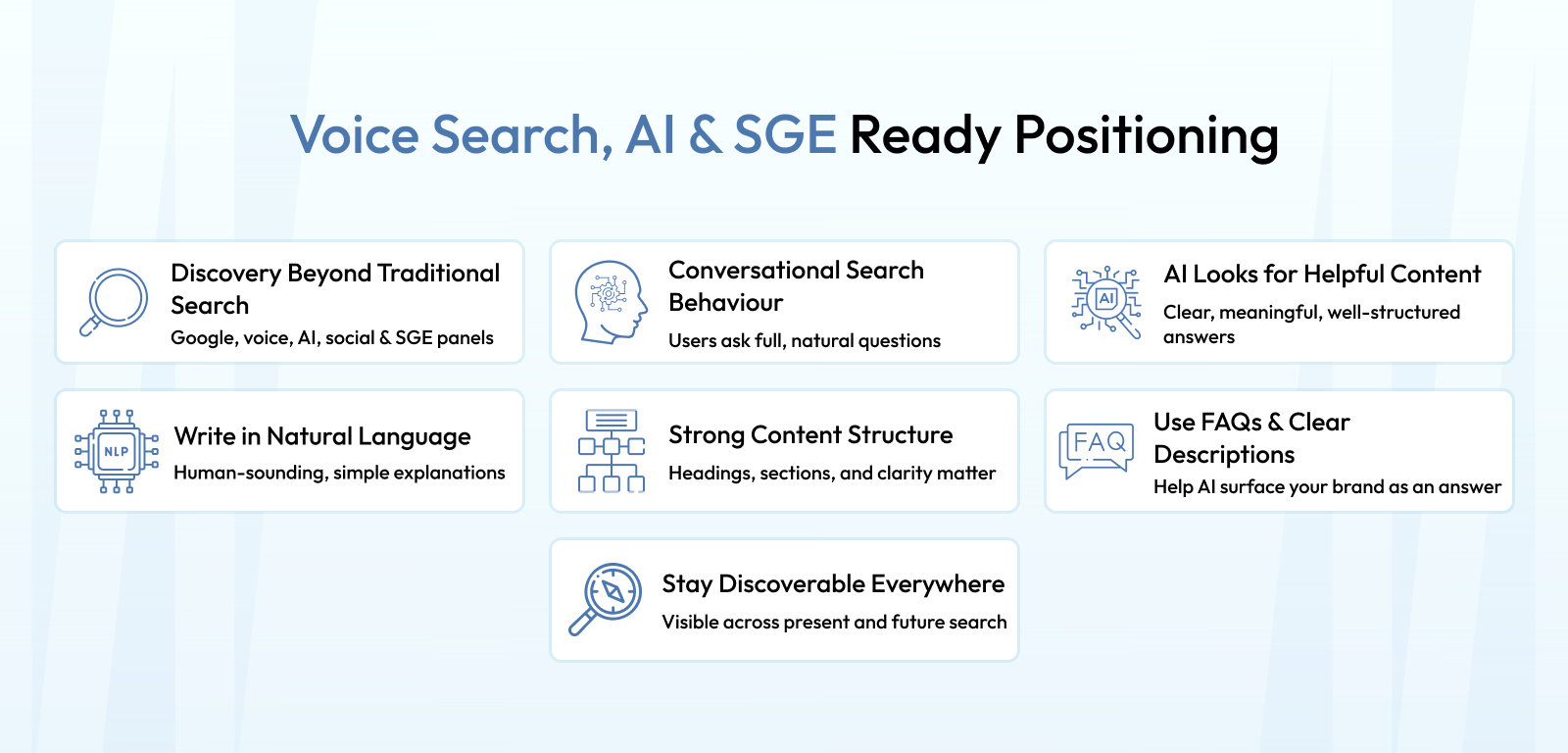 Modern search is conversational. Instead of typing short keywords, users speak or ask complete questions. AI systems look for content that sounds natural, helpful, and clearly structured. This means your website should focus on answering real customer queries in simple language — not just targeting keywords.