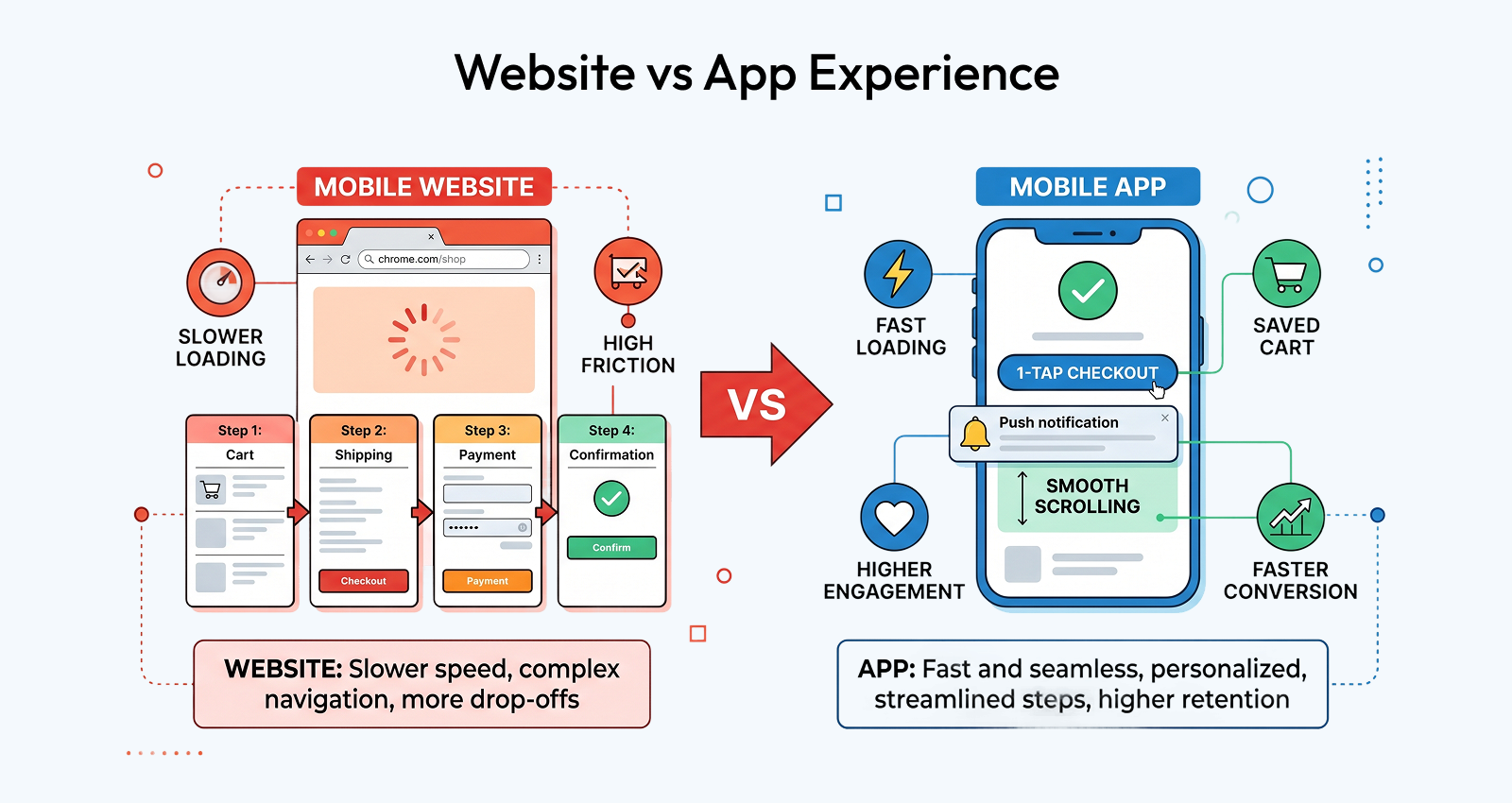 The data backs this up. Mobile app conversion rates are consistently higher than mobile web rates — often three to five times higher. Average order values tend to be higher in apps too, partly because the experience removes friction and partly because push notifications and personalised offers can nudge buyers toward completing a purchase they might have abandoned on a browser.