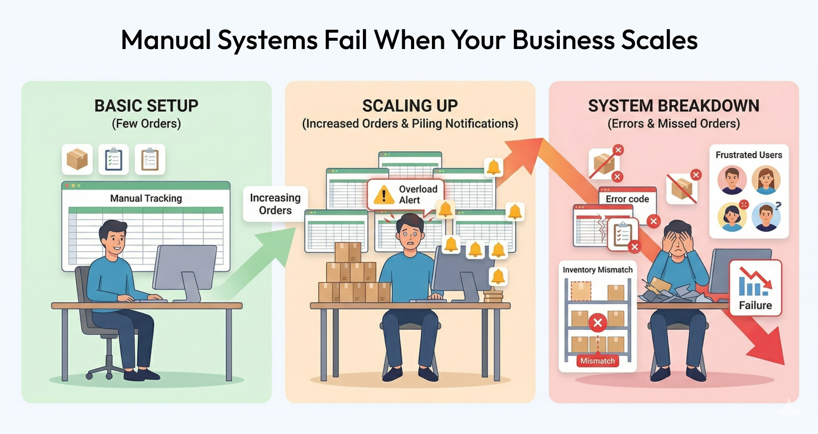 A basic setup — a simple website with manual order tracking — works fine at five orders a day. At fifty orders, it starts to crack. Inventory goes out of sync. Payments fail silently. Customers do not receive confirmation emails. Your team spends more time firefighting than selling.